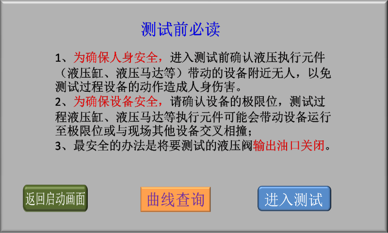 3、確認現(xiàn)場人員和設(shè)備安全后,點擊“進入測試”,進入液壓閥測試類型選擇畫面;