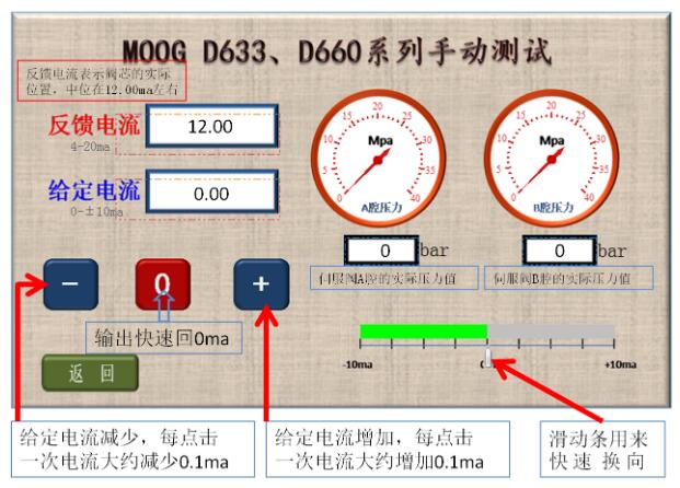 6、伺服閥正常時的表現(xiàn)為:a、給定電流0ma時,反饋電流在12.00ma,伺服閥輸出的A、B腔壓力相同;b、用滑動條可迅速換向,反饋電流改變且A、B腔壓力差較大;c、點擊增加按鈕,反饋電流逐漸增加且A、B腔壓力差逐漸增大;d、點擊減少按鈕,反饋電流逐漸減少且A、B腔壓力差逐漸減少,過0ma后伺服閥會換向;
